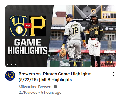 2025-05-23 update: continuing the pattern the Brewers / Youtube served me highlights after the 8-5 win over the Pirates: